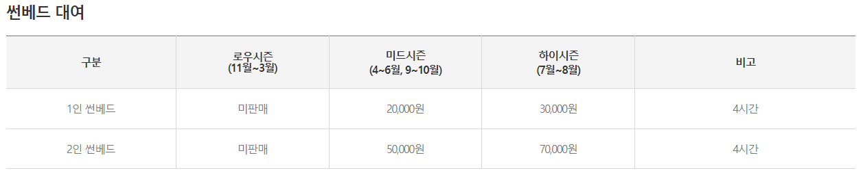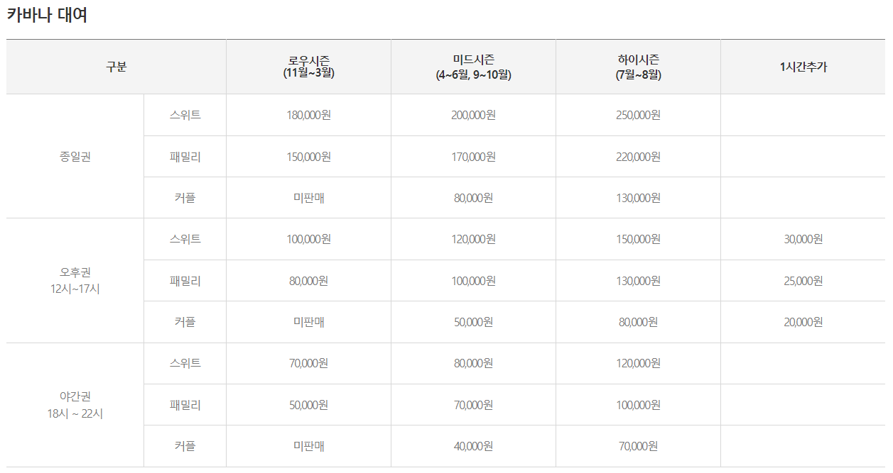 이용 시간 및 카바나, 썬베드, 물품 대여